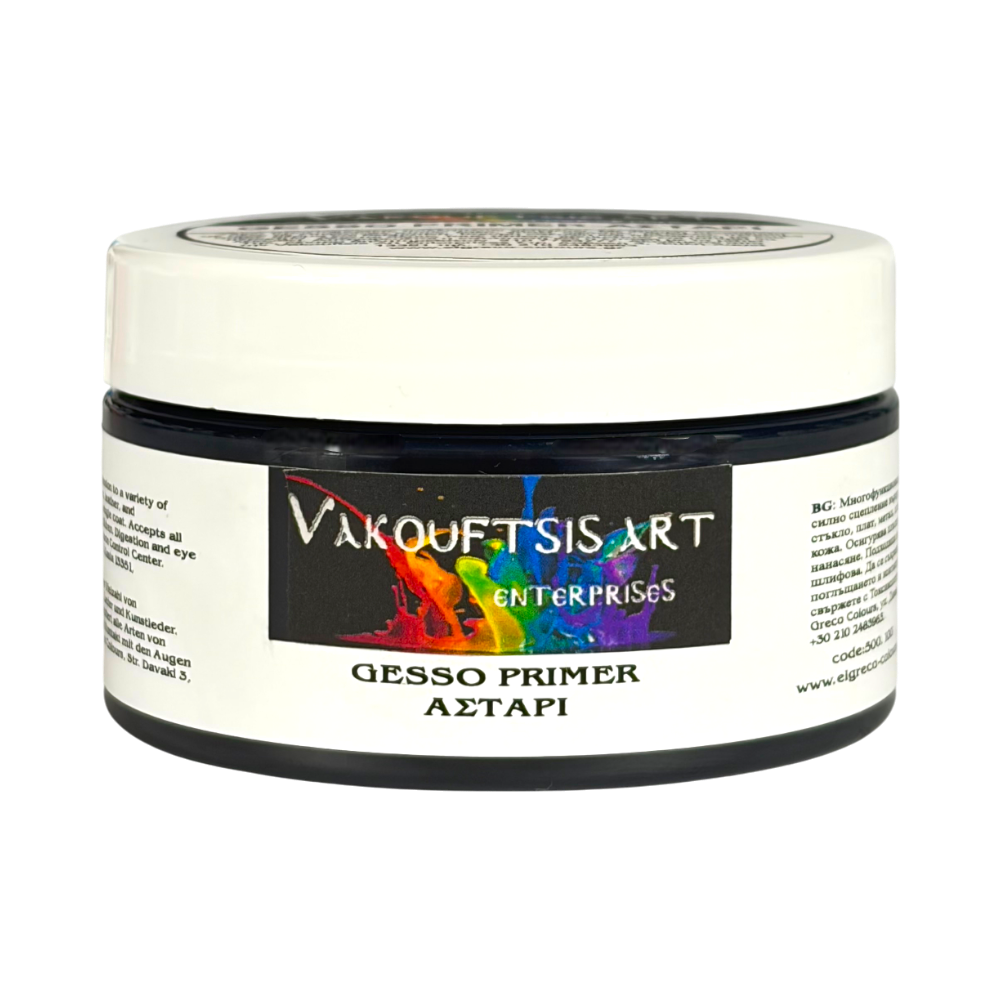 Primer for canvas, wood, plastic, glass, paper, etc. Highly flexible with excellent adhesion and full coverage in a single coat. Creates a smooth surface that can be sanded. Accepts all types of paints. Water-soluble, non-toxic, and crack-resistant.