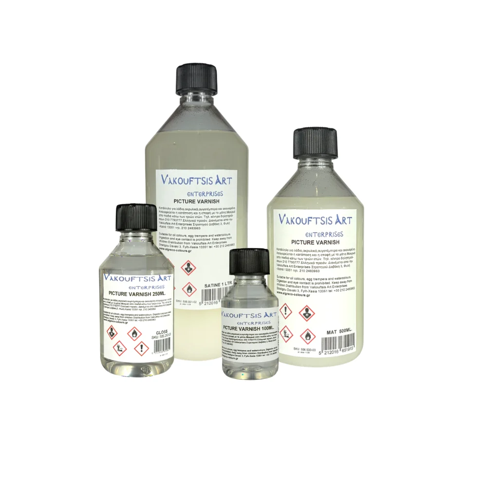 Our picture varnish is a acrylic solventborne high quality varnish. Specialized for acrylics and oil-based colours. With a UV sunscreen filter, very durable and with a great transparency. Appropriate for wood, furniture, stones, ceramic and in outdoor uses. It can be dilluted with solvent in a 10-50% ratio. We can apply two layers after the first layer is dry (approximately 1 hour). Available in gloss, mat and satine.