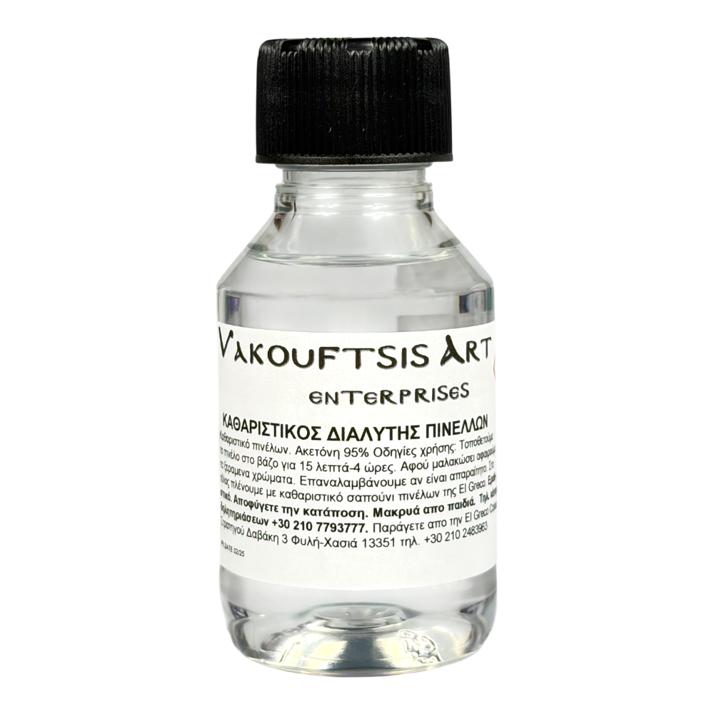 Ακετόνη 95%. Τοποθετούμε το πινέλο στο βάζο για 15 λεπτά-4 ώρες, αφού μαλακώσει αφαιρούμε τα ξεραμένα χρώματα. Αν δεν καθαρίσει πλήρως επαναλαμβάνουμε. Στο τέλος πλένουμε το πινέλο με καθαριστικό σαπούνι πινέλων.